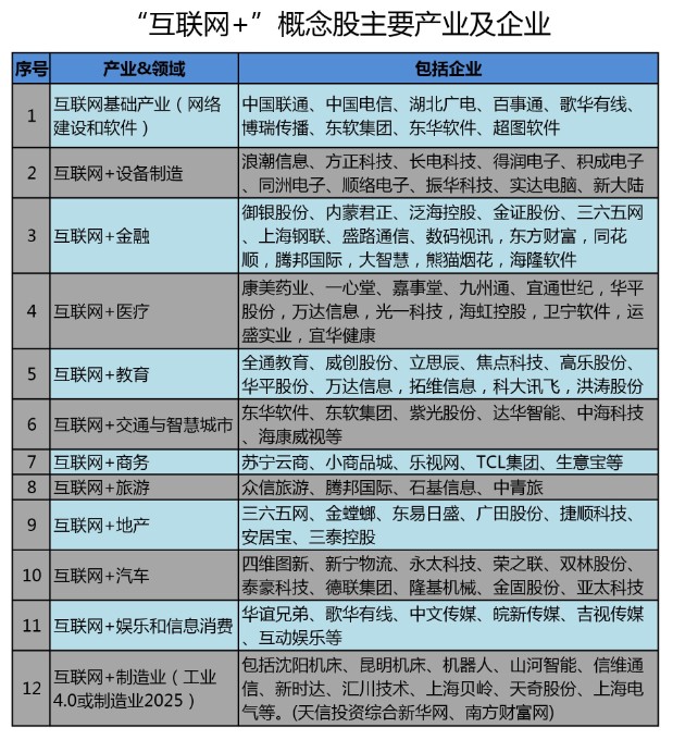 先來(lái)看看那些“互聯(lián)網(wǎng)+”概念股總體而言,大數(shù)據(jù)、云計(jì)算、物聯(lián)網(wǎng)等新技術(shù)確實(shí)正在跟更多的行業(yè)相結(jié)合,并改變了人們生產(chǎn)生活方式,在將來(lái),“互聯(lián)網(wǎng)+”對(duì)提升產(chǎn)業(yè)乃至國(guó)家綜合競(jìng)爭(zhēng)力會(huì)發(fā)揮其關(guān)鍵性作用。而通過(guò)“互聯(lián)網(wǎng)+”行動(dòng)計(jì)劃,可以用新的思路和工具解決交通、醫(yī)療、教育等公共問(wèn)題,助力大眾創(chuàng)業(yè)、萬(wàn)眾創(chuàng)新,促進(jìn)中國(guó)經(jīng)濟(jì)保持中高速增長(zhǎng)、邁向中高端水平。在“互聯(lián)網(wǎng)+”的大趨勢(shì)下,互聯(lián)網(wǎng)與任何產(chǎn)業(yè)的碰撞都會(huì)成為主題投資方向,在股市上自然也更為人們所關(guān)注與熱炒。大多數(shù)言論都認(rèn)為這些股票的相關(guān)企業(yè)可能會(huì)成為新的經(jīng)濟(jì)增長(zhǎng)點(diǎn)。這些產(chǎn)業(yè)包括以下幾個(gè)方向:互聯(lián)網(wǎng)金融、互聯(lián)網(wǎng)娛樂(lè)、互聯(lián)網(wǎng)商務(wù)、互聯(lián)網(wǎng)醫(yī)療、互聯(lián)網(wǎng)汽車、互聯(lián)網(wǎng)制造業(yè)等12個(gè)領(lǐng)域,下圖列出了這些領(lǐng)域的主要企業(yè)。