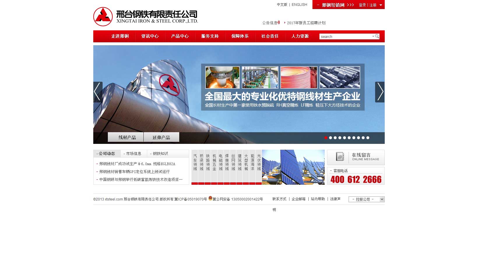 邢臺鋼鐵有限責任公司(以下簡稱邢鋼),始建于1958年,全國最大的優特鋼線材專業生產企業和國內品種最多的線材企業。“全國五一勞動獎狀”、“中國最佳自主創新企業”、“中國AAA級信用企業”、“中國企業社會責任特別大獎”、“全國模范勞動關系和諧企業”、“全國質量獎”、“高新技術企業”等榮譽獲得者。網址:http://xtsteel.com/